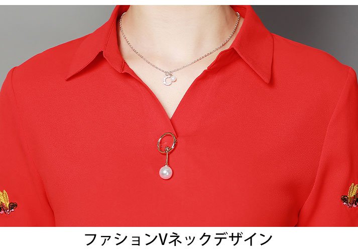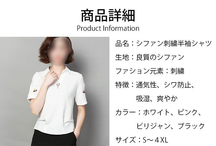 シファン刺繍半袖シャツ 通気性、シワ防止、吸湿、爽やか